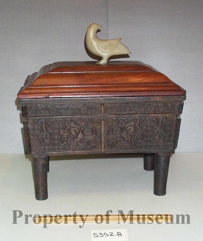 Bronze Ming Dynasty ceremonial box with Teakwood cover and white jade bird on top. Rectangular opening in the bottom of the box. Piece which fits in the opening is still intact. Exterior of the box is ornamented with designs.